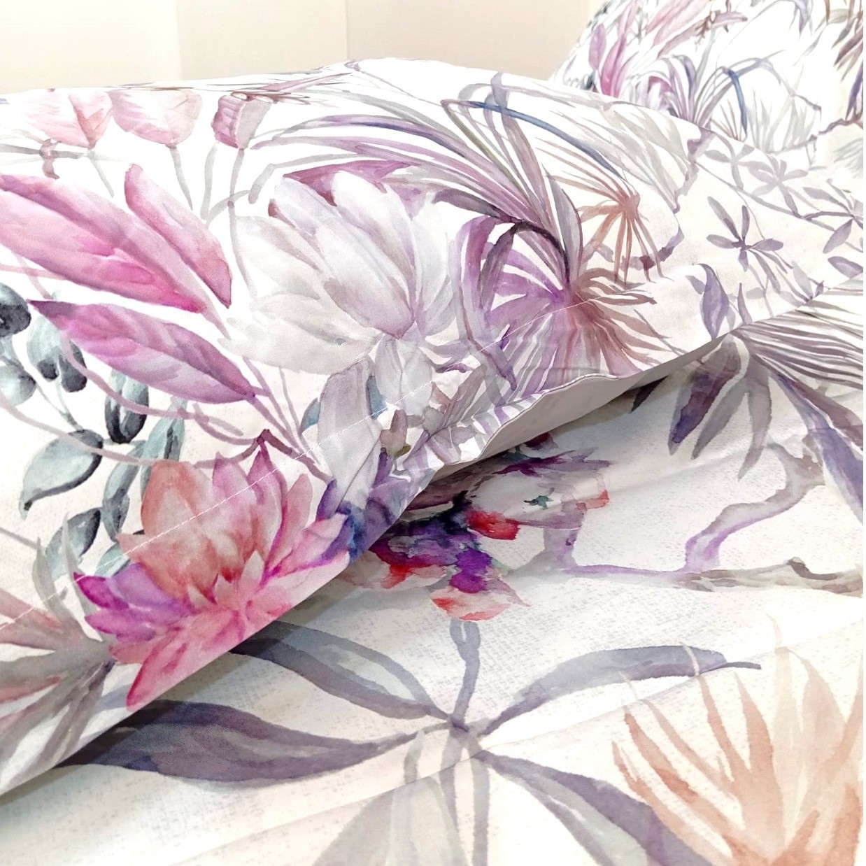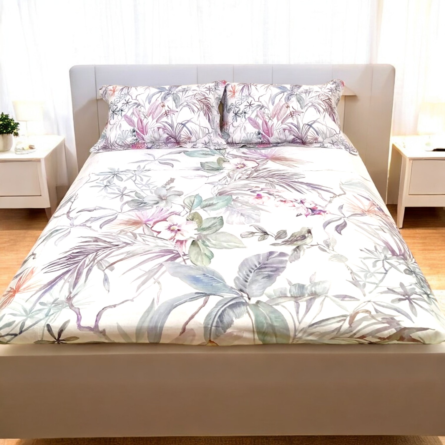 Realizzato in pregiato raso di cotone, questo completo offre una sensazione di morbidezza e lucentezza incomparabile, unita alla vivacità e alla precisione della stampa digitale.
