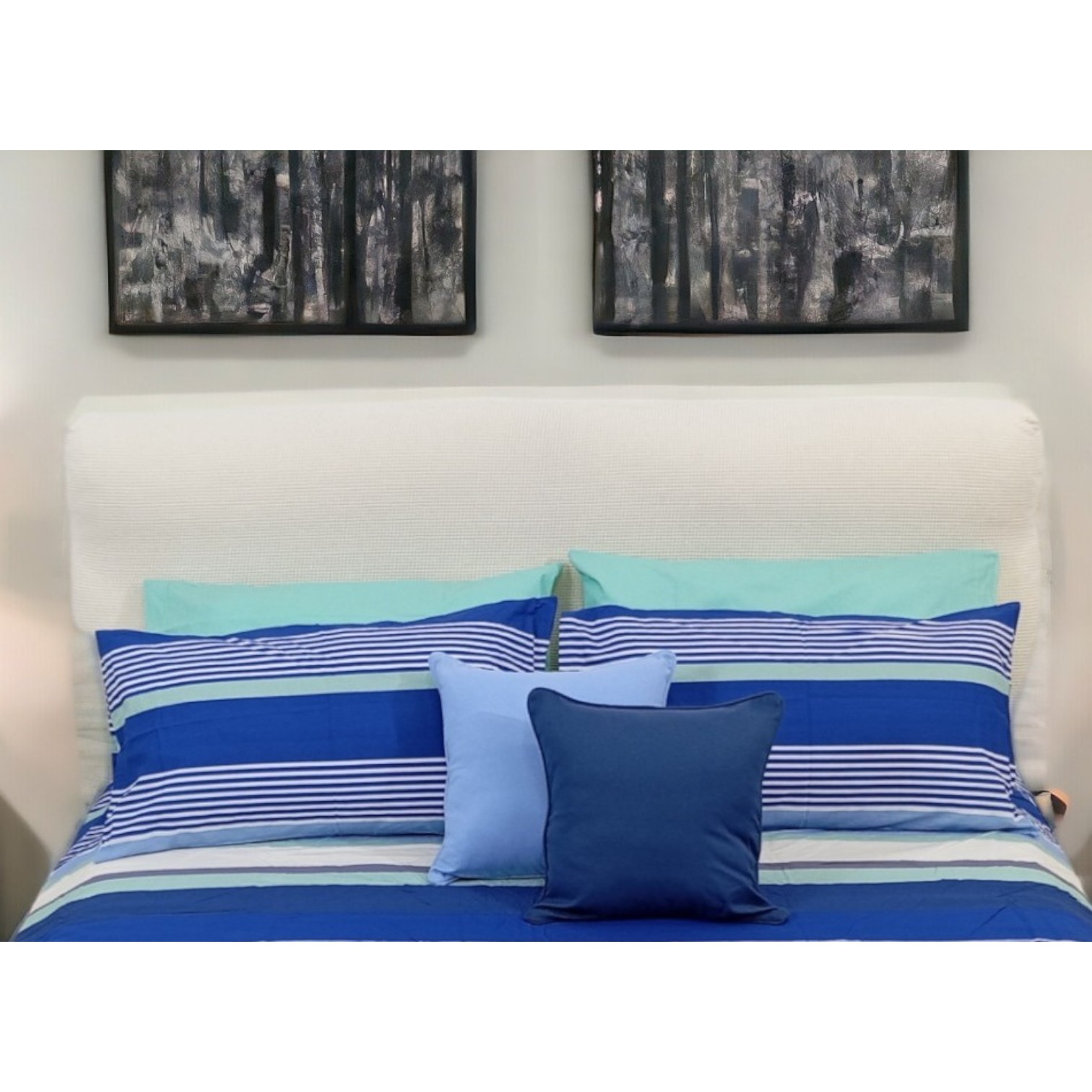 Il copripiumino è disponibile in due varianti: una variante ha una bellissima multiriga sui toni del senape, ruggine, panna e grigio fumo che si alternano. L'altra variante ha invece la multiriga sui toni del panna, azzurro, blu e acquamarina.