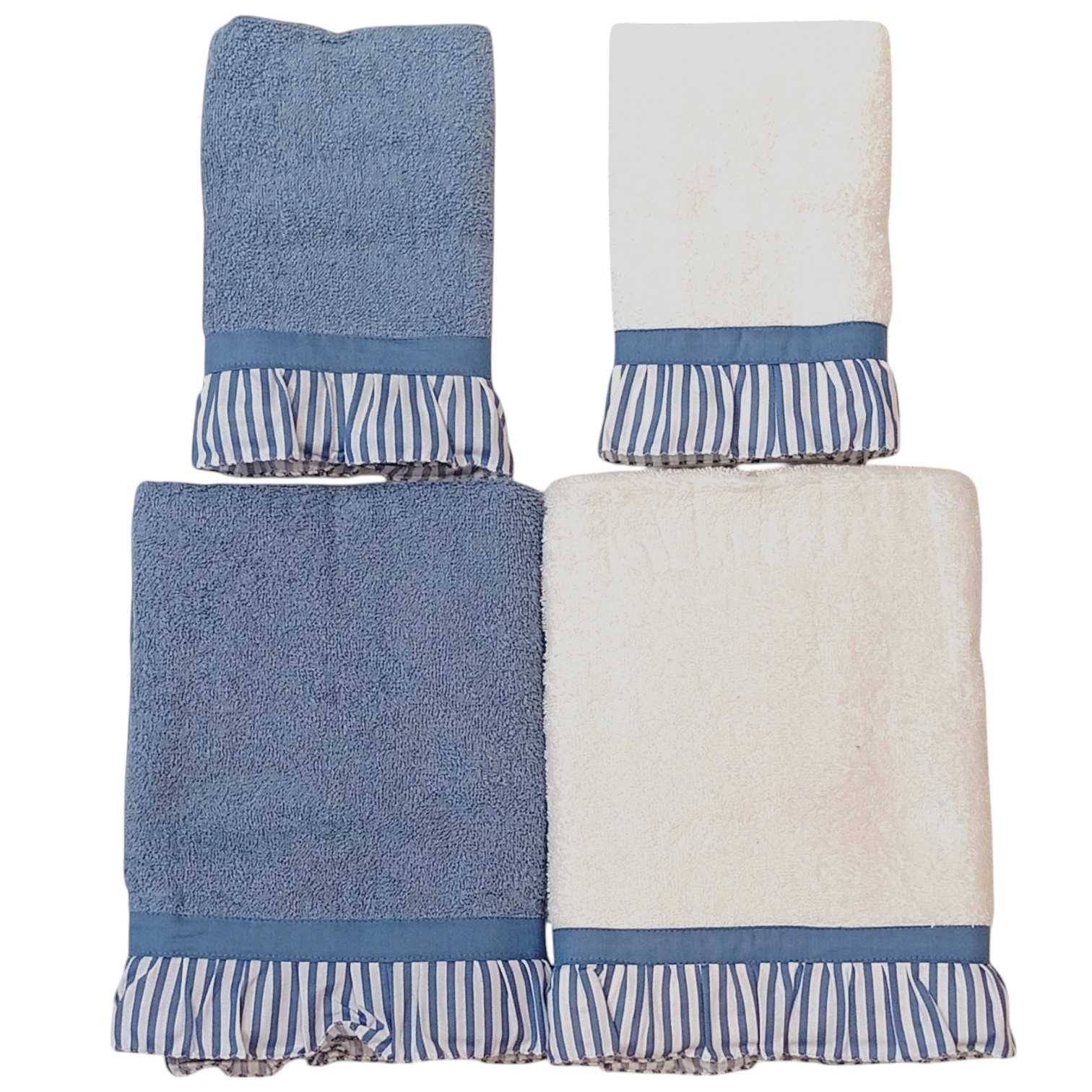 I nostri asciugamani da bagno in morbidissima spugna 100% cotone da 450 gr/mq sono totalmente artigianali. Sono rifiniti con una bellissima balza con riga montecarlo lavorata a volant ed impreziosita da un elegante profilo in raso. Perfetto da regalare!!!