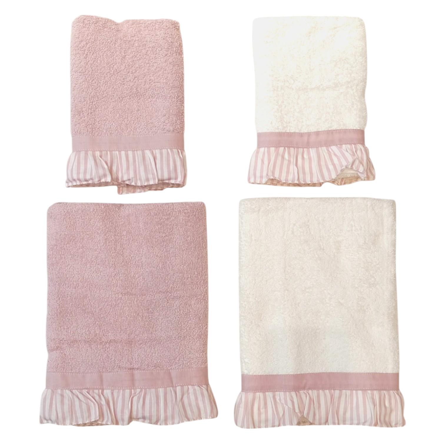 I nostri asciugamani da bagno in morbidissima spugna 100% cotone da 450 gr/mq sono totalmente artigianali. Sono rifiniti con una bellissima balza con riga montecarlo lavorata a volant ed impreziosita da un elegante profilo in raso. Perfetto da regalare!!!