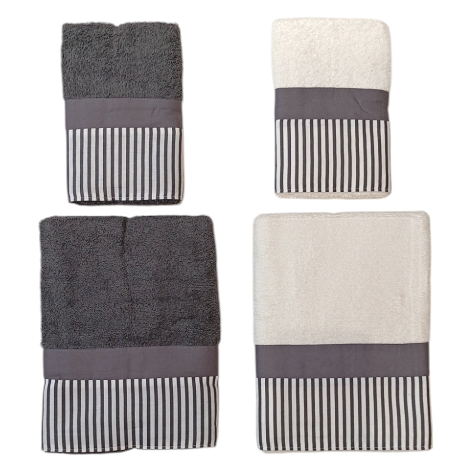Il set è perfetto per la coppia, con due asciugamani a fondo chiaro ed altri due a fondo scuro.