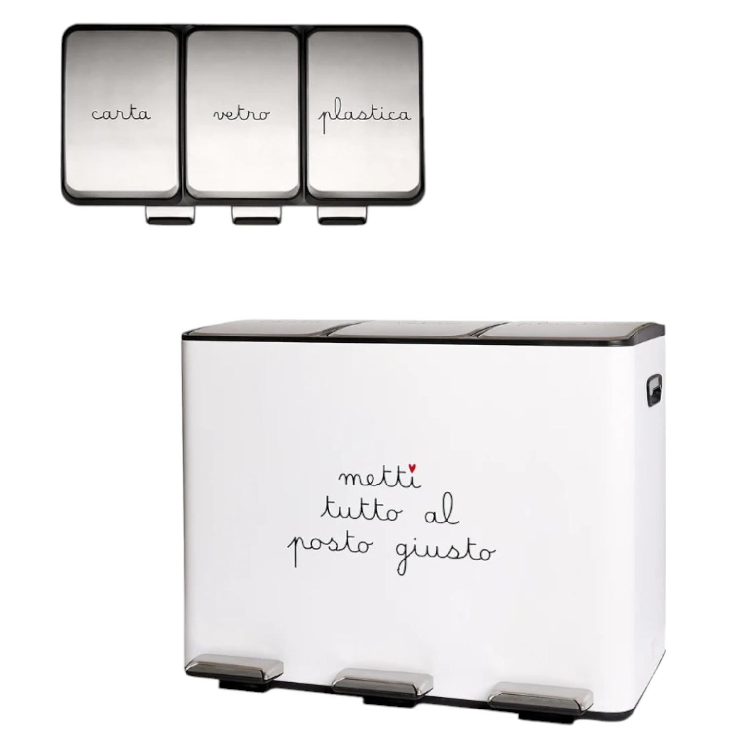 Pattumiera da interno 3 x 15 litri decoro Metti tutto al posto giusto - bianco - Dim. 61 x 37 x h47 cm