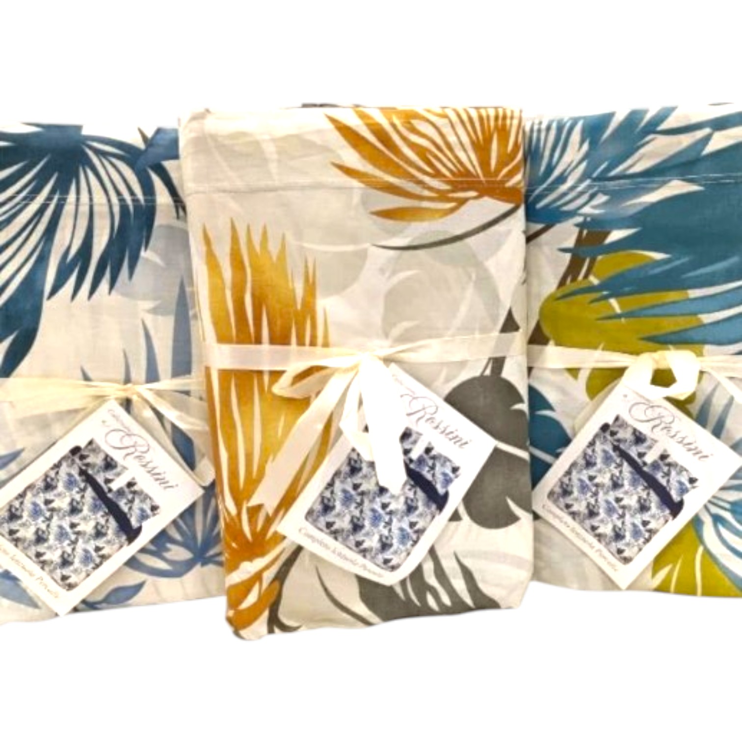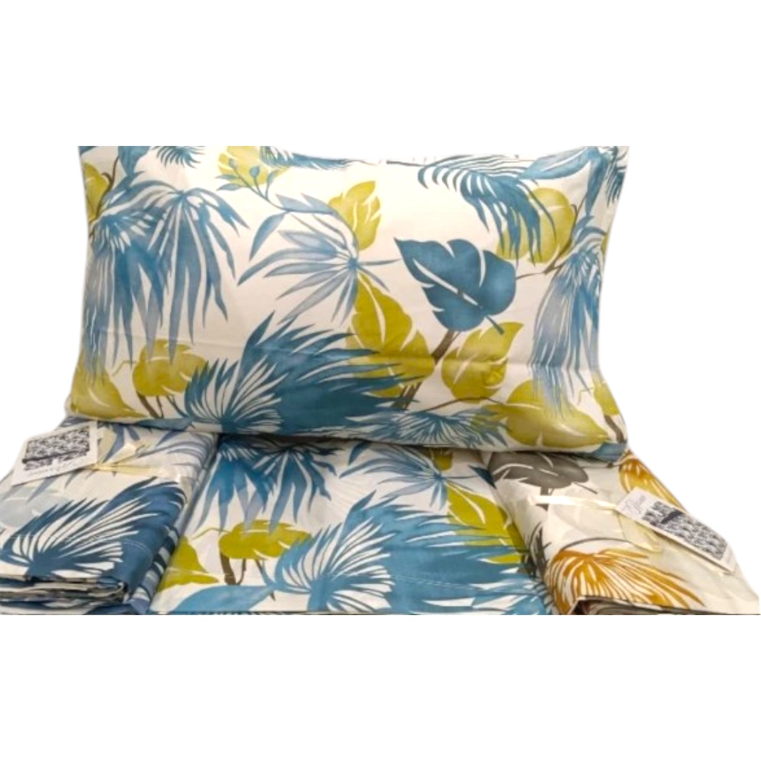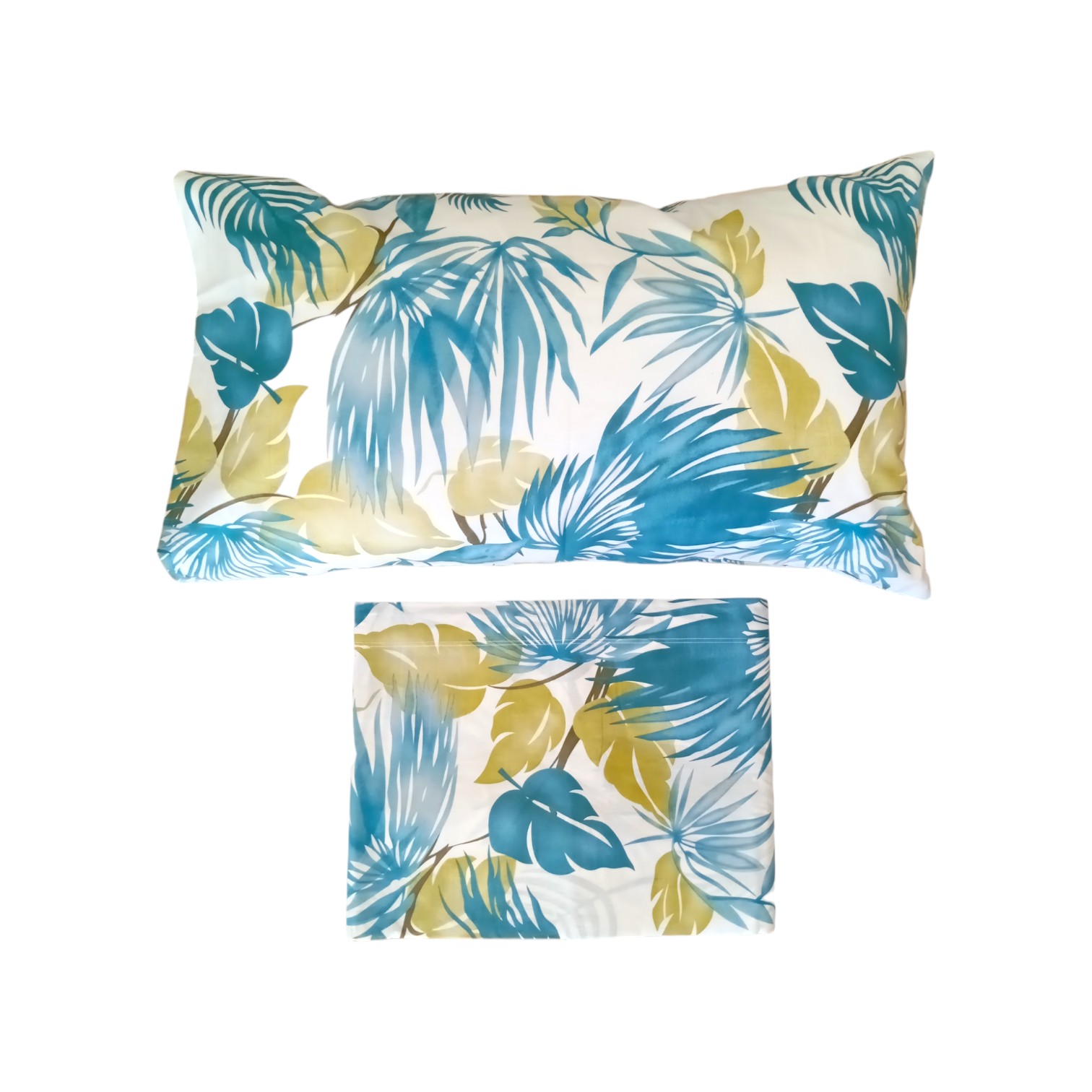 Completo Letto Jamaica in Puro Cotone con bellissime palme nei toni dell'azzurro e del verde.