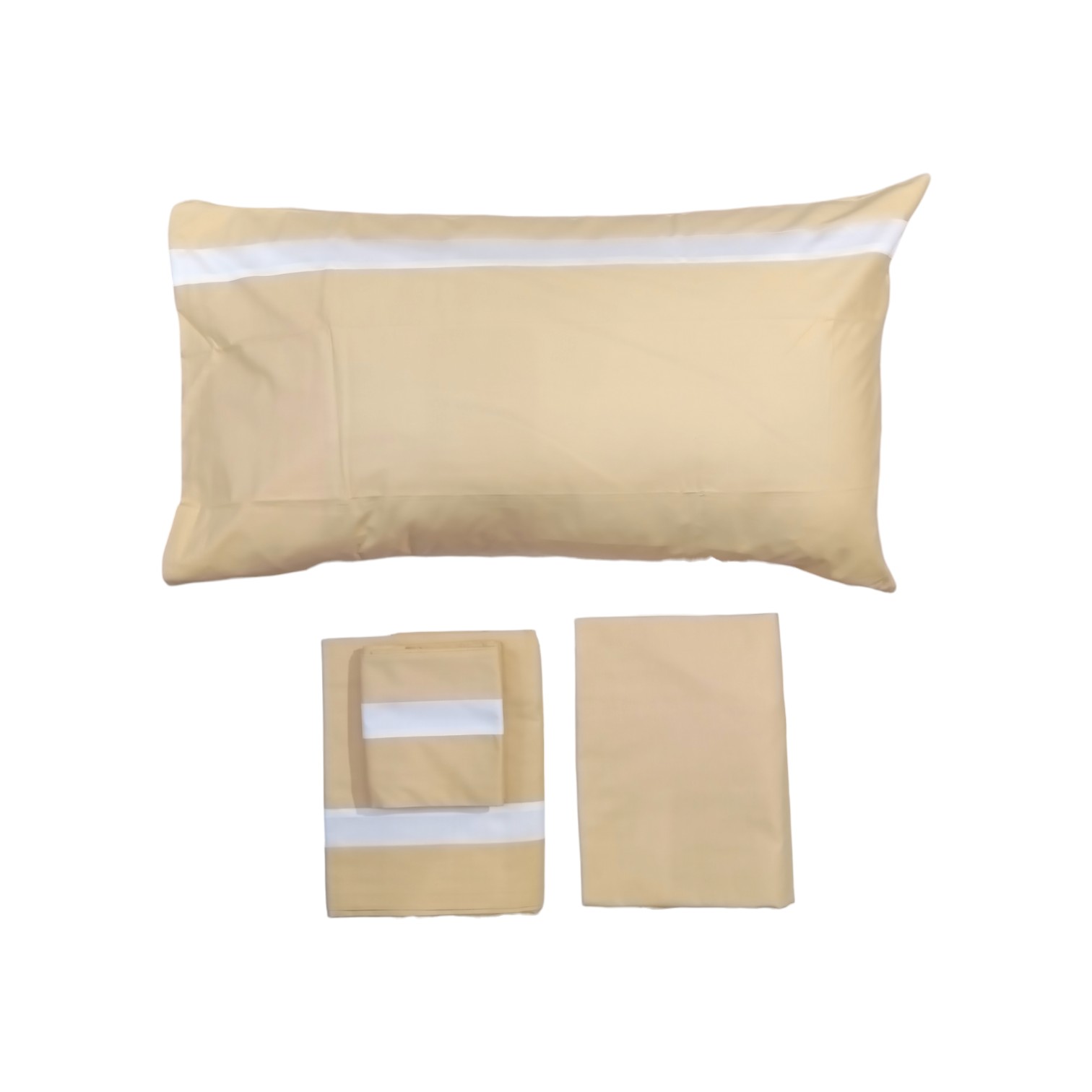 Il completo è in puro cotone " pelle ovo ", finissimo e resistente, con un rapporto tra trama e ordito che rende il prodotto morbido e allo stesso tempo compatto, resistente all'usura e ai lavaggi.
