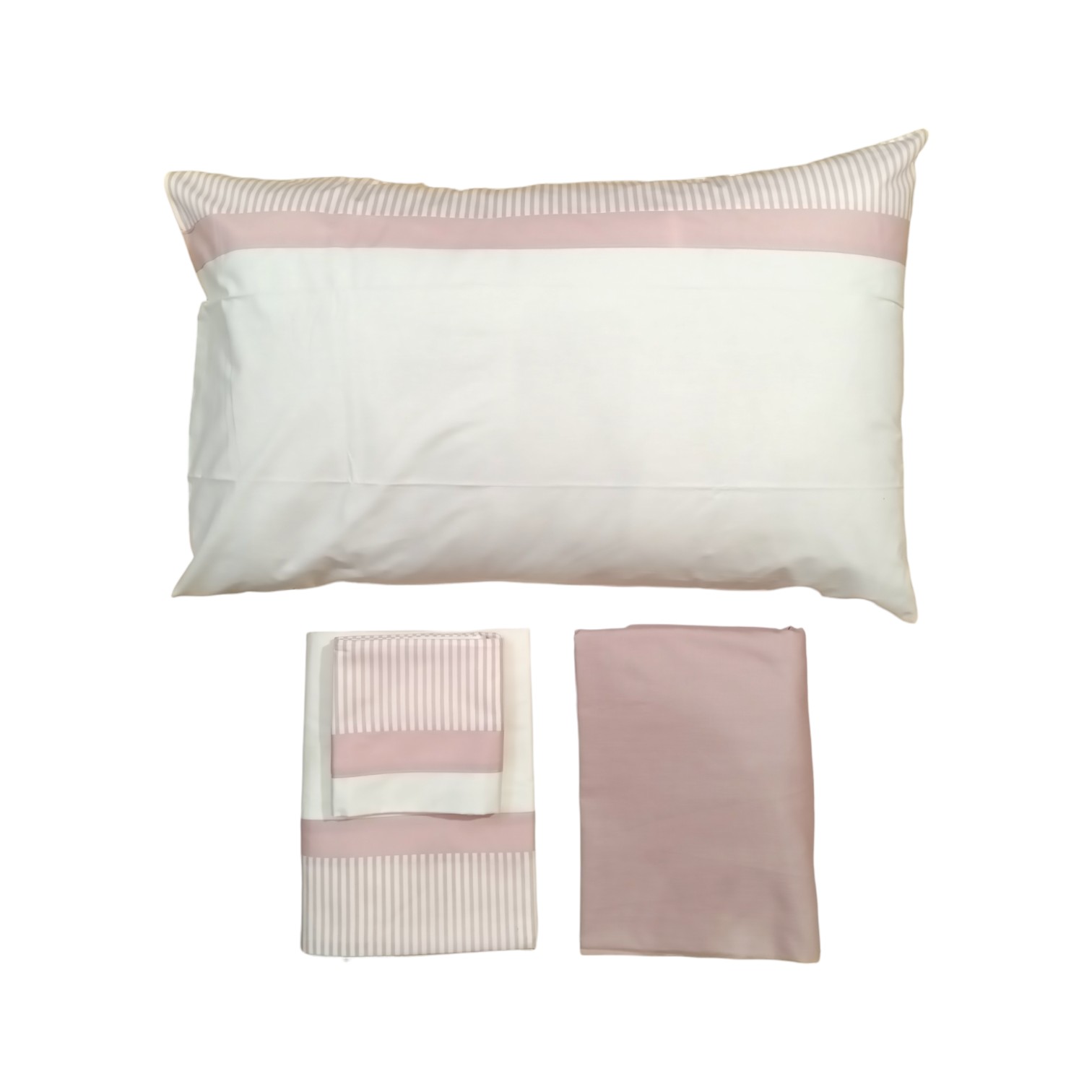 Il completo è in puro cotone " pelle ovo ", finissimo e resistente, con un rapporto tra trama e ordito che rende il prodotto morbido e allo stesso tempo compatto, resistente all'usura e ai lavaggi.