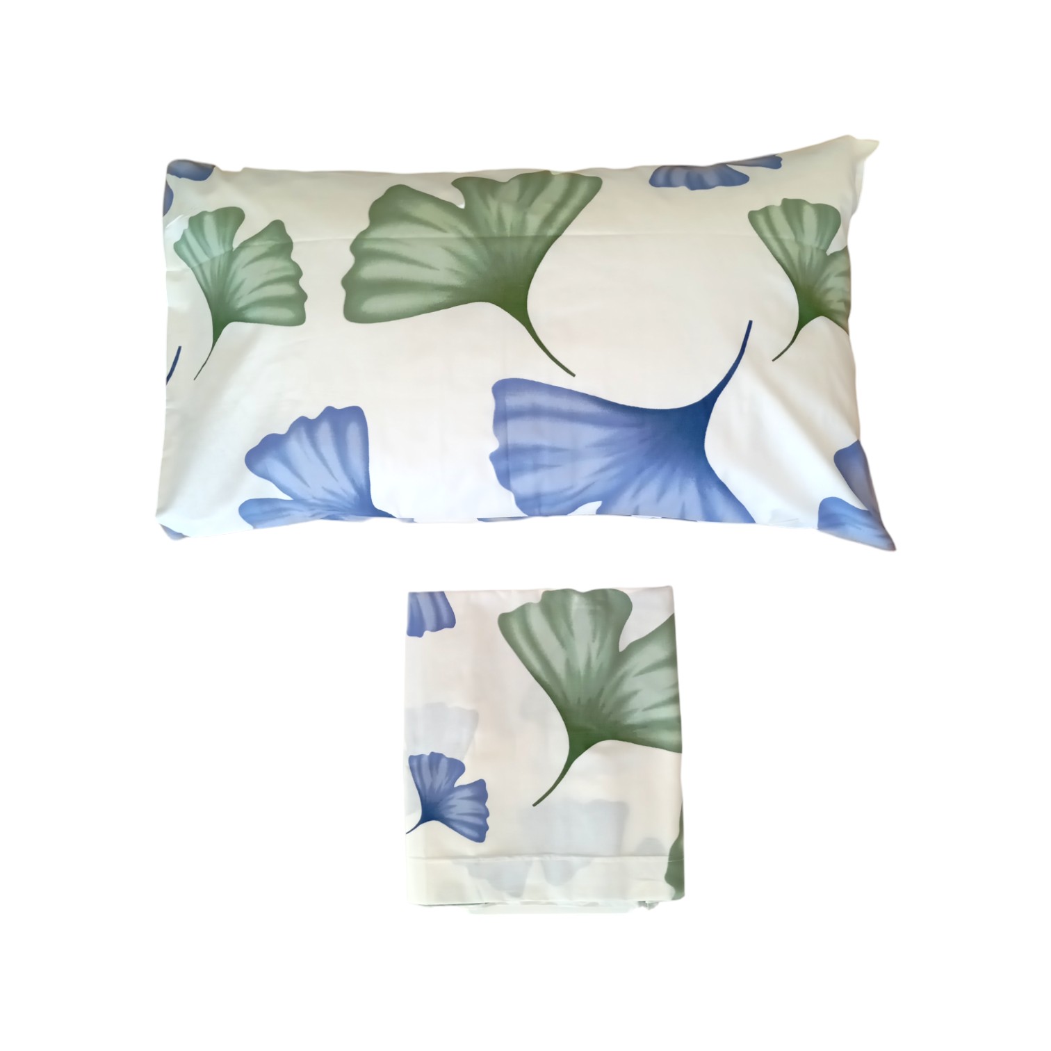 La delicata fantasia raffigura eleganti foglie di Ginkgo Biloba stilizzate in una raffinata tonalità petrolio e rosa malva su un fondo chiaro, creando un'atmosfera rilassante e un look moderno e botanico.