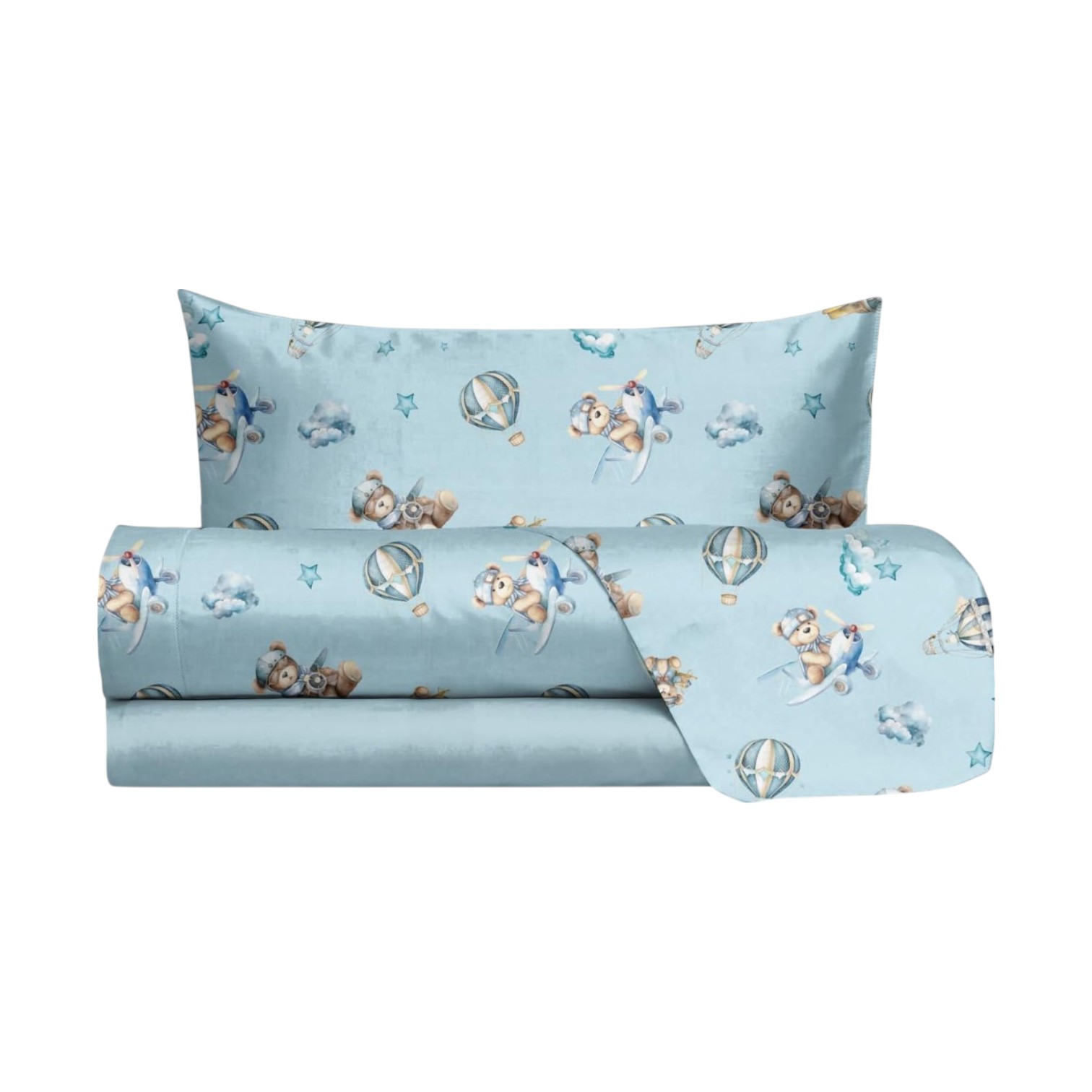 Porta un cielo di dolci sogni nella stanza dei tuoi piccoli con questo incantevole completo lenzuolo a tema orsetti volanti. Ogni notte sarà un'avventura nel paese dei sogni più teneri!