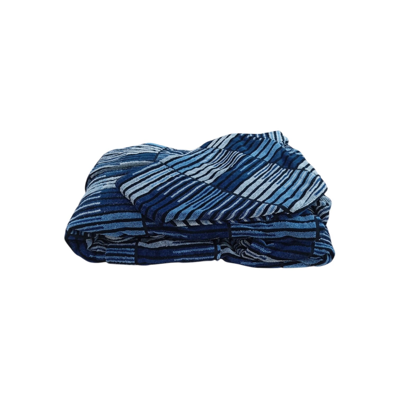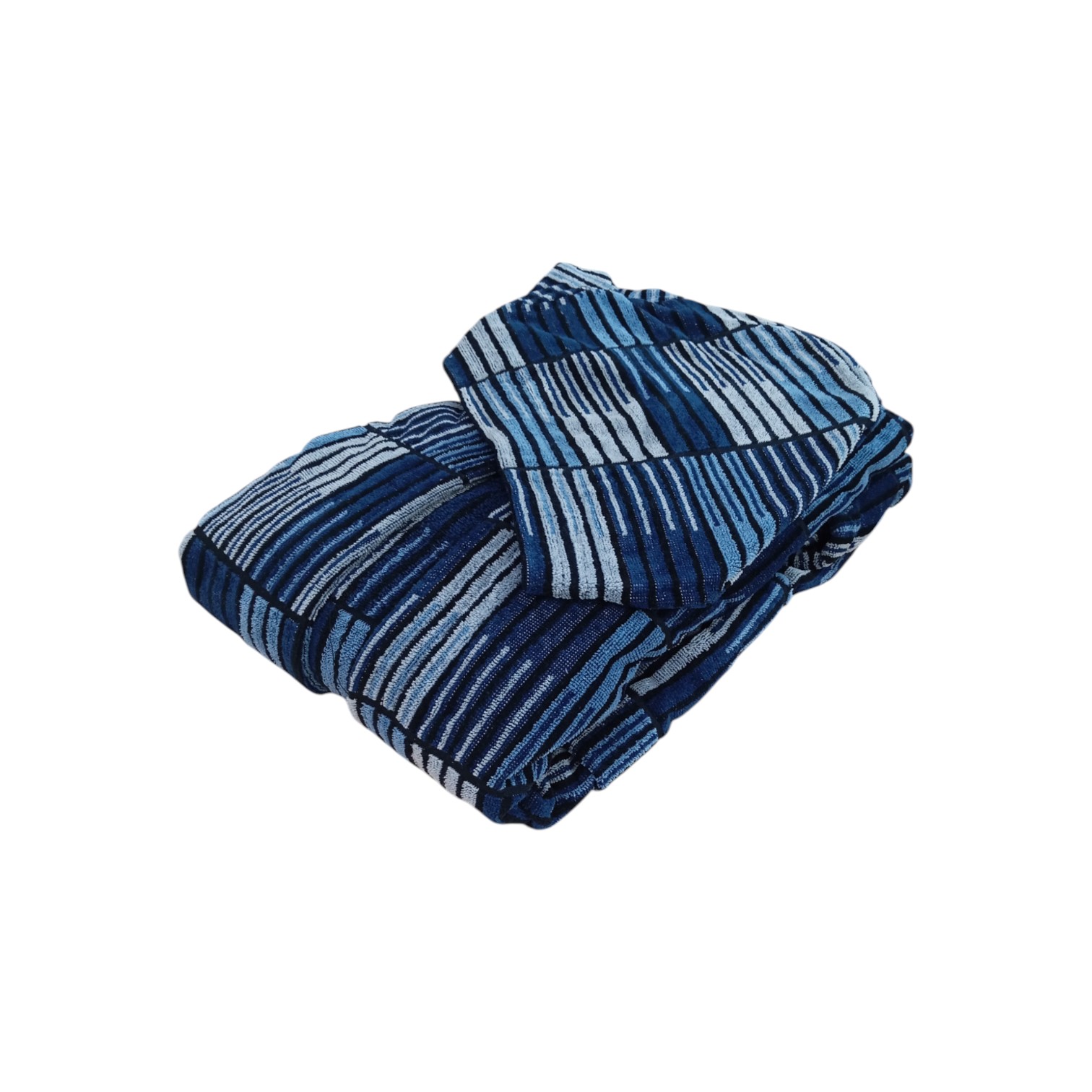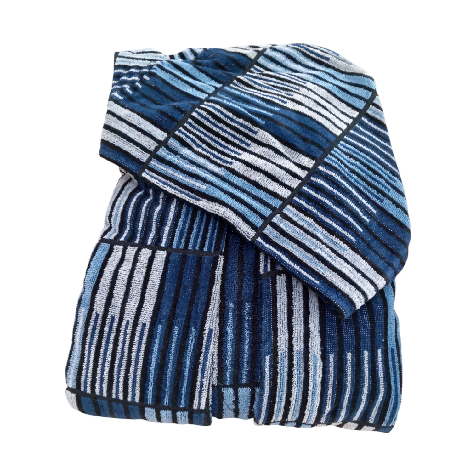 Questo accappatoio incarna l'eleganza minimalista e il lusso discreto. Il design, in lavorazione jacquard, gioca sui contrasti tra i colori azzurro, navy e grigio, e conferisce un tocco raffinato e particolare. Il cappuccio ampio e la cintura in vita, dello stesso tessuto, garantiscono una vestibilità perfetta e un look curato. Le due comode tasche frontali aggiungono praticità senza compromettere lo stile. La silhouette è morbida e fluida, pensata per avvolgerti in un abbraccio di comfort.