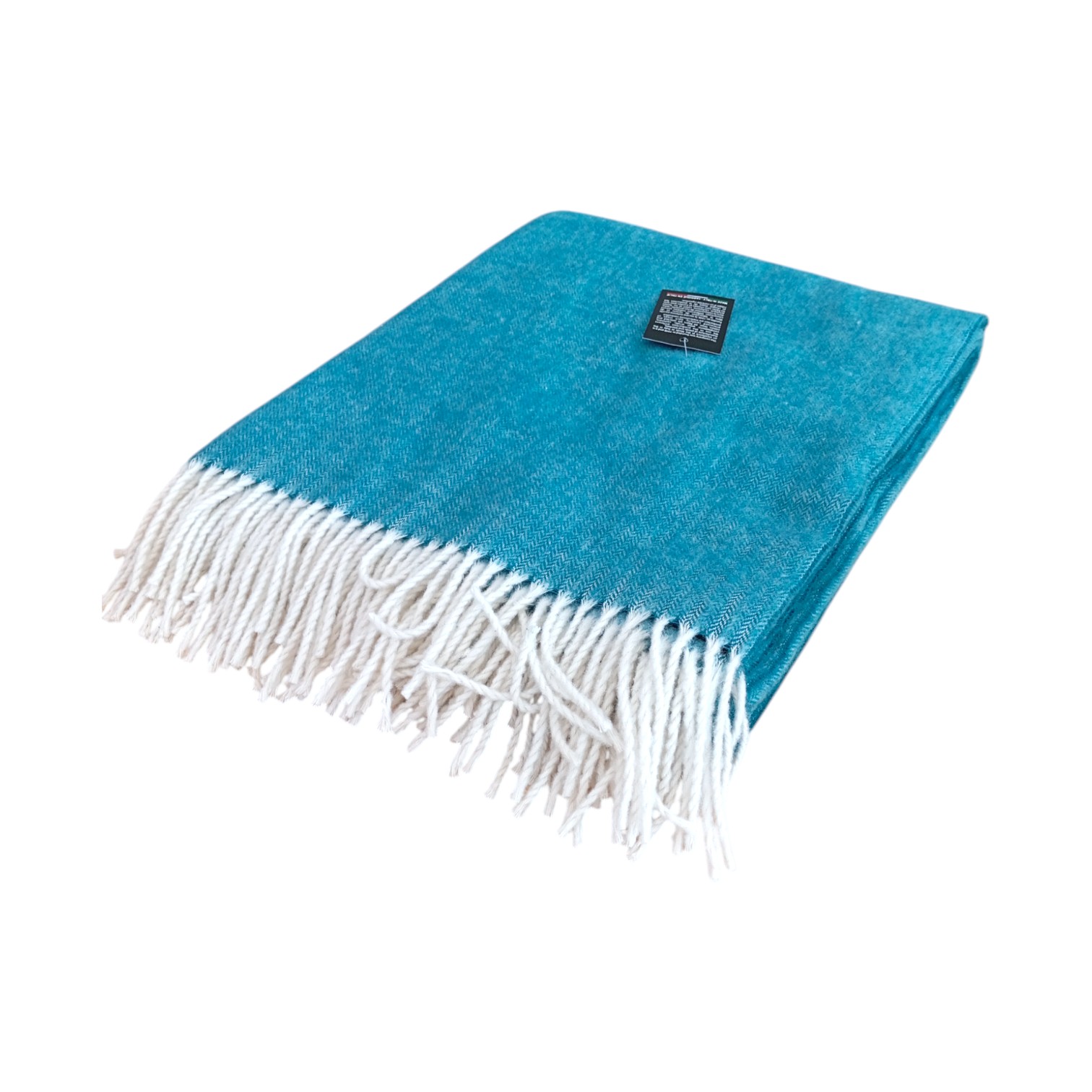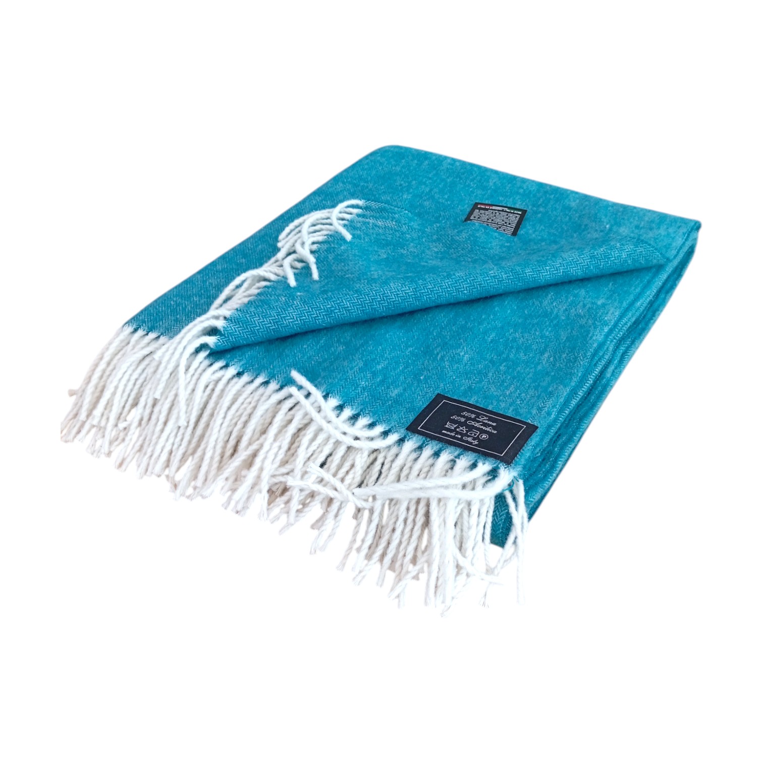Il plaid è "spigato", un tipo di armatura che crea una disegno diagonale simile alle spighe di grano. In più è rifinito con belle e caratteristiche frange a contrasto.
