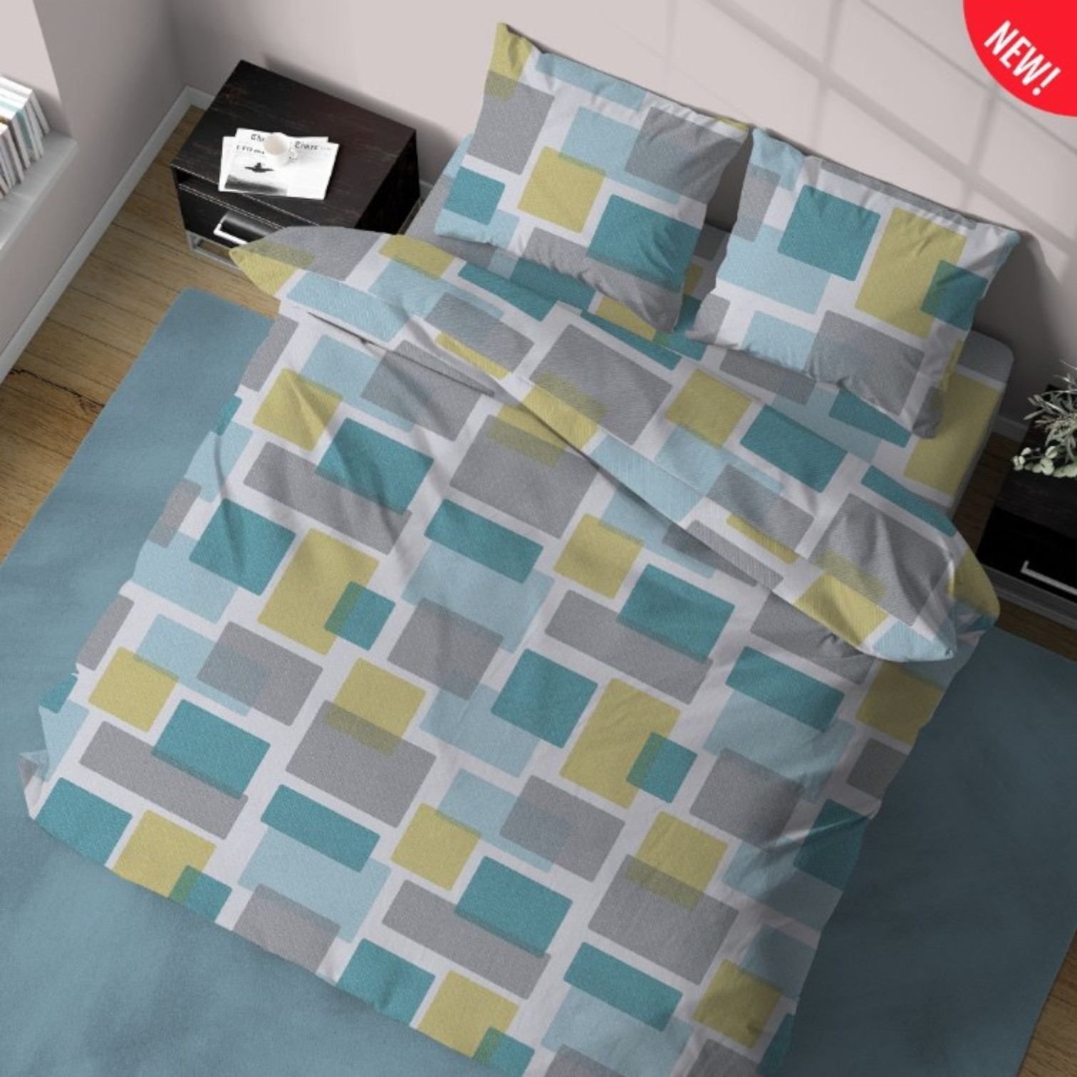 Questa fantasia geometrica è un mix di quadrati e rettangoli di diverse dimensioni e colori. Le tonalità dei colori si fondono armoniosamente creando un’atmosfera moderna e frizzante.