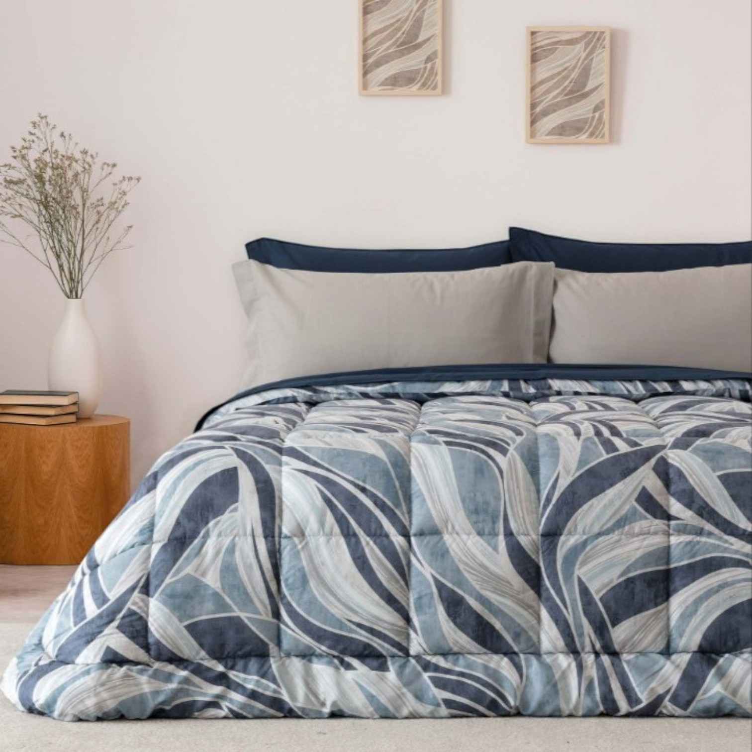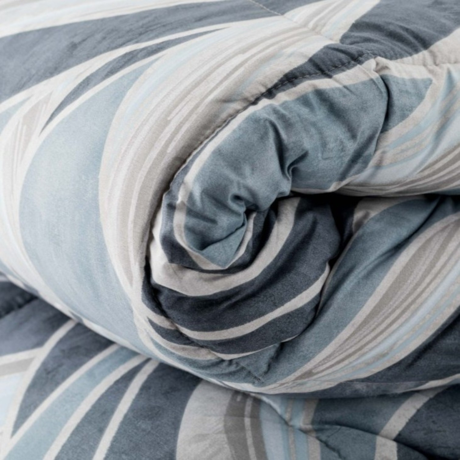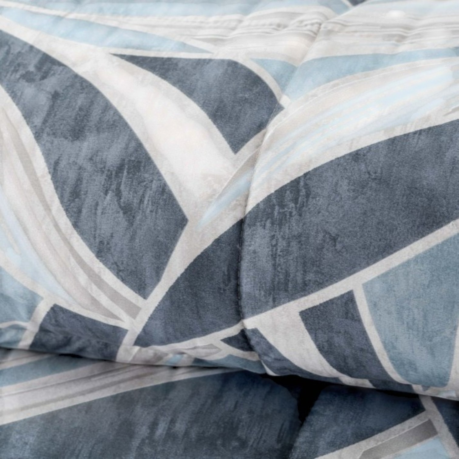 Eleganza moderna in una palette di blu e grigi. Questa trapunta invernale presenta un audace motivo astratto a onda, che dona un tocco contemporaneo e dinamico alla tua camera da letto. Ideale per chi cerca calore e uno stile deciso.