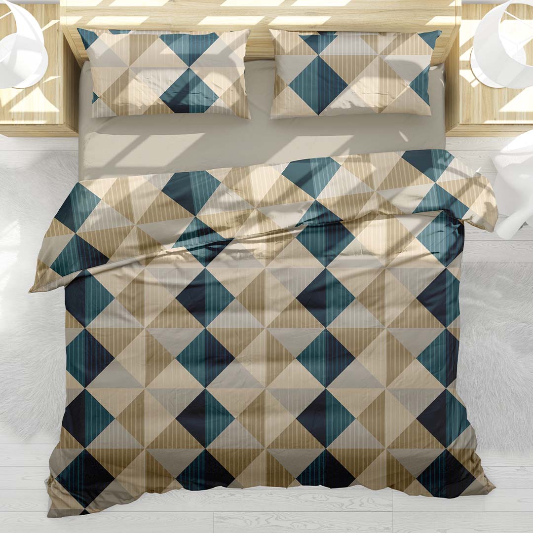 Questo set di lenzuola è caratterizzato da una vivace fantasia a grandi riquadri geometrici composti da triangoli, in un affascinante mix di colori e texture: