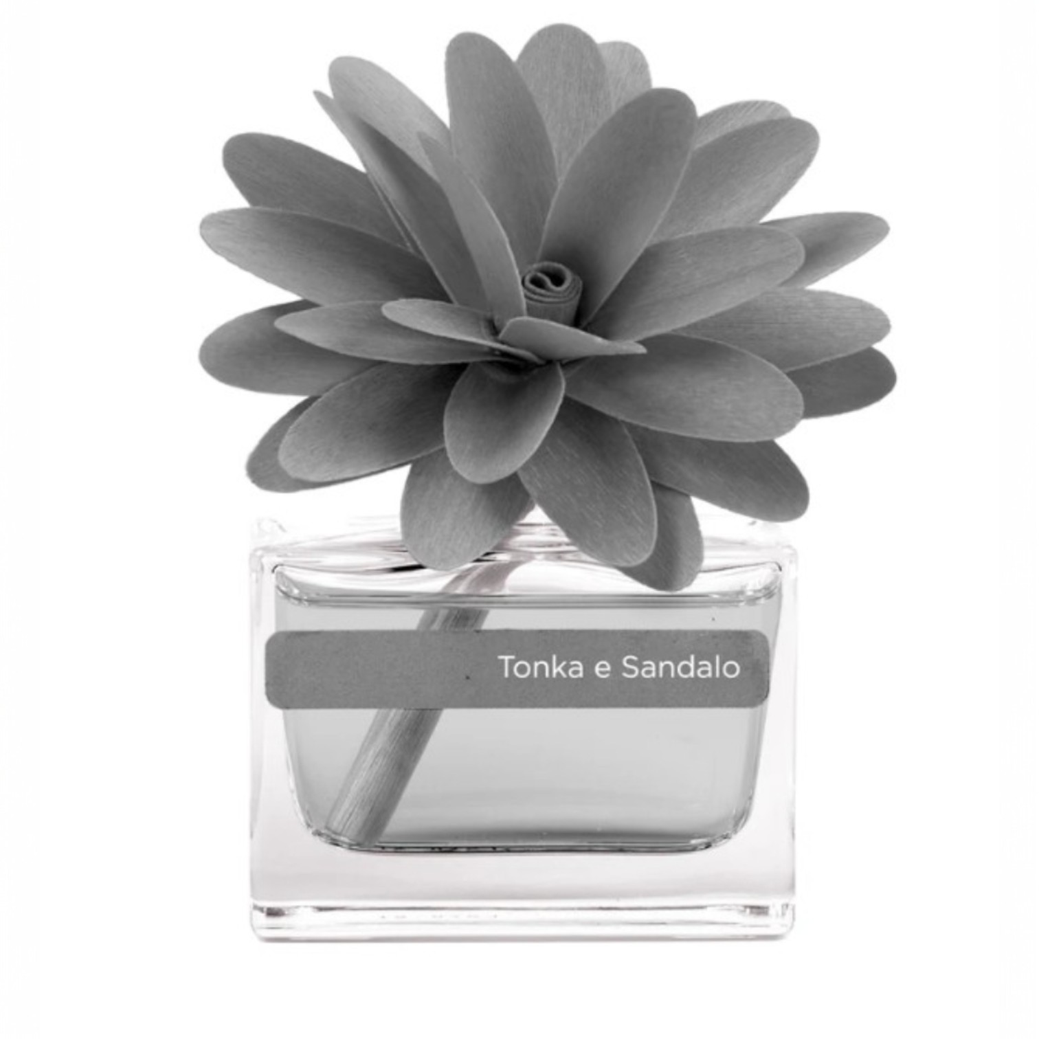 Profumatore per ambiente in una raffinata confezione di vetro con diffusore a forma di fiore in legno di betulla naturale realizzato a mano.