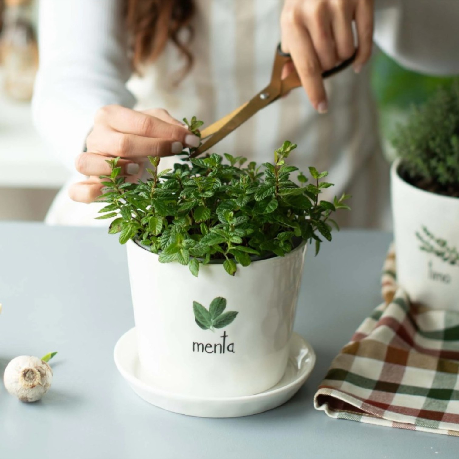Vaso bianco in gres porcellanato decoro Menta, con sottovaso